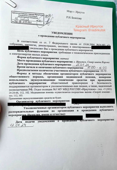 Инициативная группа жителей Иркутского района подала в администрацию Иркутска заявку на проведение митинга, посвященного проблеме подключения к электрическим сетям. Как сообщает телеграмм-канал «Красный Иркутск», организаторы хотят провести митинг на сквере имени Кирова во второй половине дня 25 июля. Ожидается, что в нем примут участие 50-70 человек. Известно, что в Иркутском районе есть проблемы с подключением к сетям 4 тысяч домов, поступают жалобы и от жителей Шелеховского района.
