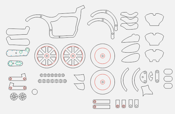 В первой части статьи был описан и показан процесс по созданию 2д проекта мотоцикла и детализация для подготовки раскладки на ЧПУ станок. Материал МДФ выбрал из тех соображений, что он дешевый, достаточно легко клеится, поддается обработке, окраске и при необходимости леко расщепляется, кроме того любой ЧПУ станок его легко режет, как бумагу, ой, да ведь это и так почти бумага :) Поскольку сам не владею ЧПУ станком, работа была отдана в руки "маэстро". Перед обработкой решил сначала сделать пробную сборку, чтобы убедиться что все детали подходят. При первой сборке выяснилось, что угол у вилки задан слишком большой - переделали, исправили и заново выфрезеровали. К этому моменту детали уже притерты, появилось некоторое понимание по недочетам, которые тут же были исправлены в чертежах и подпилены и подшлифованы. Бензобак сидушка и колеса обрабатывались на небольшом станке, в качестве окончательной обработки была использована губка 180, и ей же затерты все остальные части. Перед пок