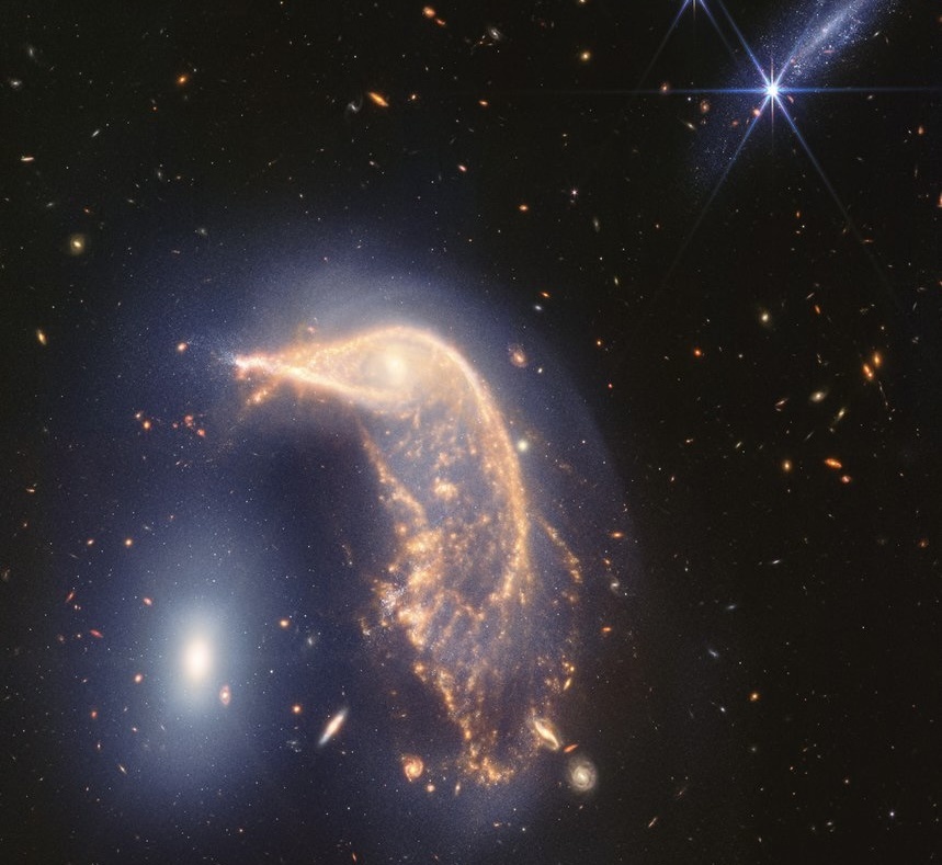 Космический телескоп "Джеймс Уэбб" от NASA зафиксировал слияние двух галактик. Галактики Пингвин и Яйцо, известные как Arp 142, были изучены с помощью телескопа Уэбба. Его снимки ясно показывают, что эти галактики связаны дымкой, обозначенной синим цветом, представляющей собой смесь звезд и газа. По данным космического агентства, постоянное взаимодействие галактик началось примерно 25-75 миллионов лет назад. Через несколько сотен миллионов лет они сольются в одну галактику. Друзья, у Multiverse Time есть Telegram-канал. Подписывайтесь, чтобы не пропустить много интересного о космосе! Arp 142 расположена на расстоянии 326 миллионов световых лет от Земли в созвездии Гидра. Галактика Яйцо выглядит как небольшой бирюзовый овал, поскольку состоит из старых звезд и утратила или израсходовала большую часть своего газа и пыли. Галактика Пингвин раньше была спиральной, но после первого сближения ее центр стал ярко светиться, а развернутые рукава образовали клюв, голову, позвоночник и широкий х