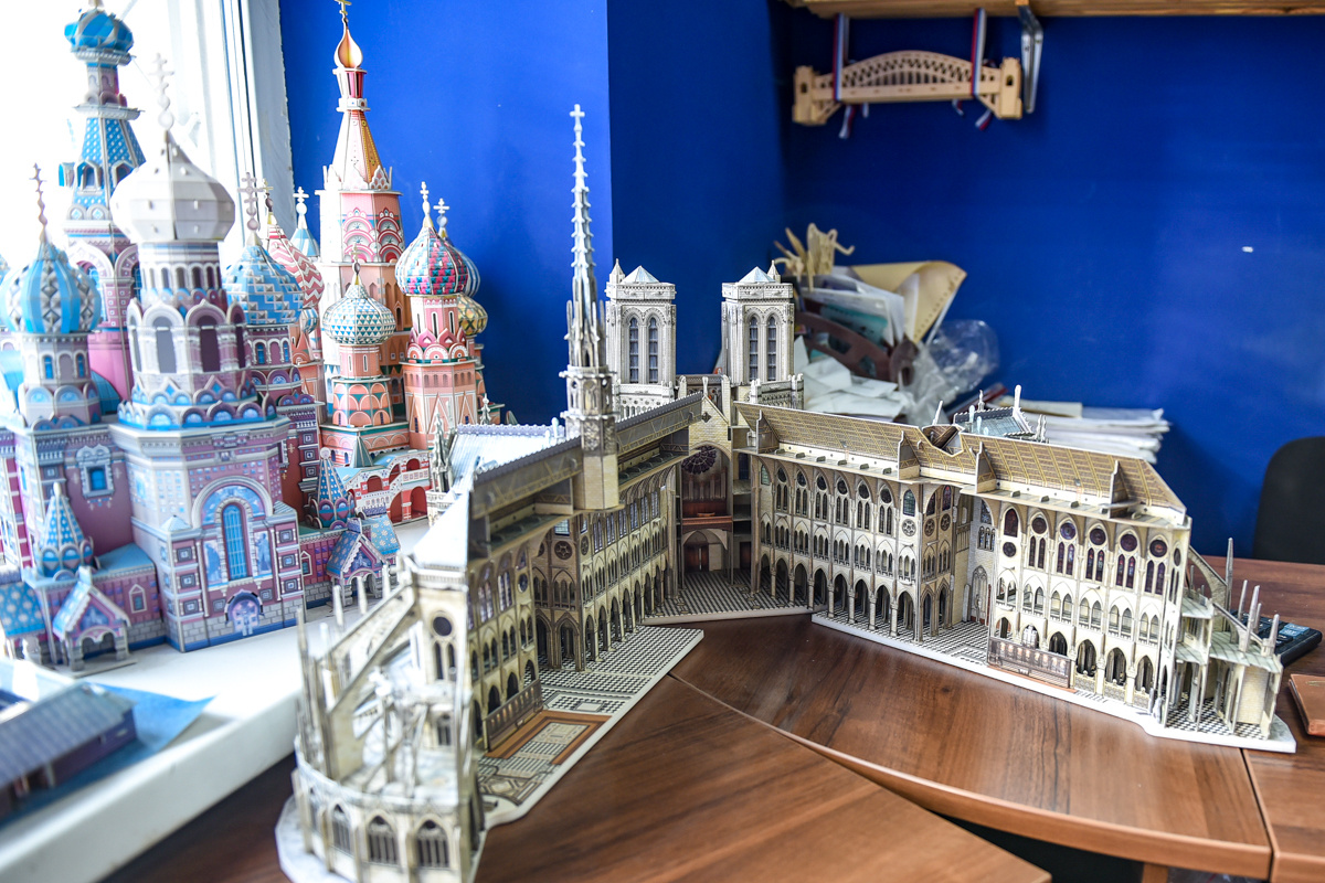 По признанию Александра Петровича, самым сложным для него оказался макет собора Василия Блаженного, который он собирал каждый вечер практически неделю. А самым трудоемким — собор Парижской Богоматери. Во-первых, в нем почти 1,5 тысячи деталей, каждая из которых должна была встать строго на свое место. Поэтому этот макет коллекционеру приходилось разбирать и собирать трижды. Во-вторых, собор Нотр-Дам‑де-Пари — не только самый крупный по размерам, но еще и раздвижной, как и некоторые другие макеты. «Раздвинув» здание, можно заглянуть в него, чтобы увидеть внутреннюю отделку.