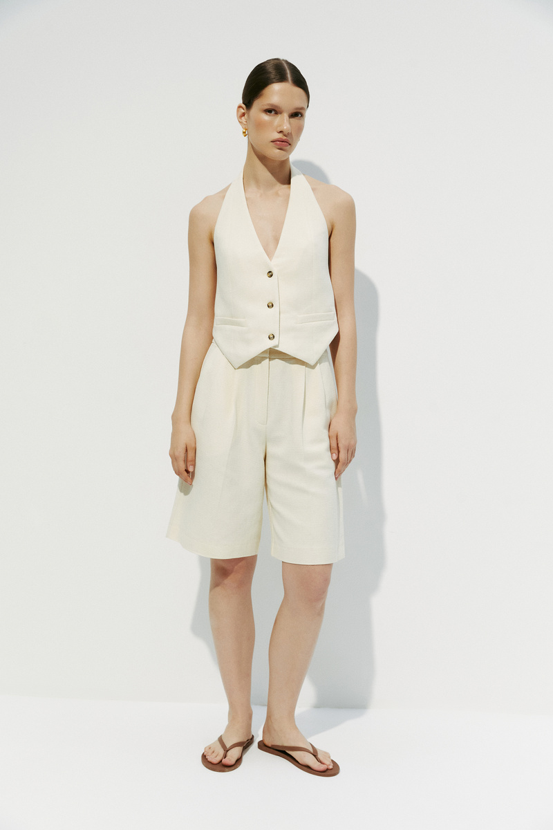 Предлагаем несколько сочетаний для тех, кто проводит июль в рабочем режиме (это, кстати, не повод расстраиваться). Charmstore Шорты выполнены из фактурной ткани. Стрелки и складки по лицевой стороне визуально вытягивают силуэт. У бренда можно собрать весьма практичный сет – к бермудам есть жилет и пиджак. Aline Шорты свободного кроя выполнены из премиального льна – ничто не заменит его летом. У бренда модель представлена в нескольких ярких цветах. Дополнить можно жакетом и жилетом (с поясом или без) из коллекции. Studio29 Удлиненная модель со стрелками и посадкой на талии. Дополнить можно жакетом от бренда и любимым топом. Drugaya Вариант для поклонников природных оттенков и расслабленности – пудровые бермуды изо льна, к которым в пару можно забрать жилет. Namelazz Бермуды с джинсовой отделкой в сером оттенке выбираем как вложение в деловой гардероб. Сочетать можно с жилетом бренда – команда переосмыслила модель, добавив глубокое декольте и карманы. 2mood Если деловой дресс-код – не дл