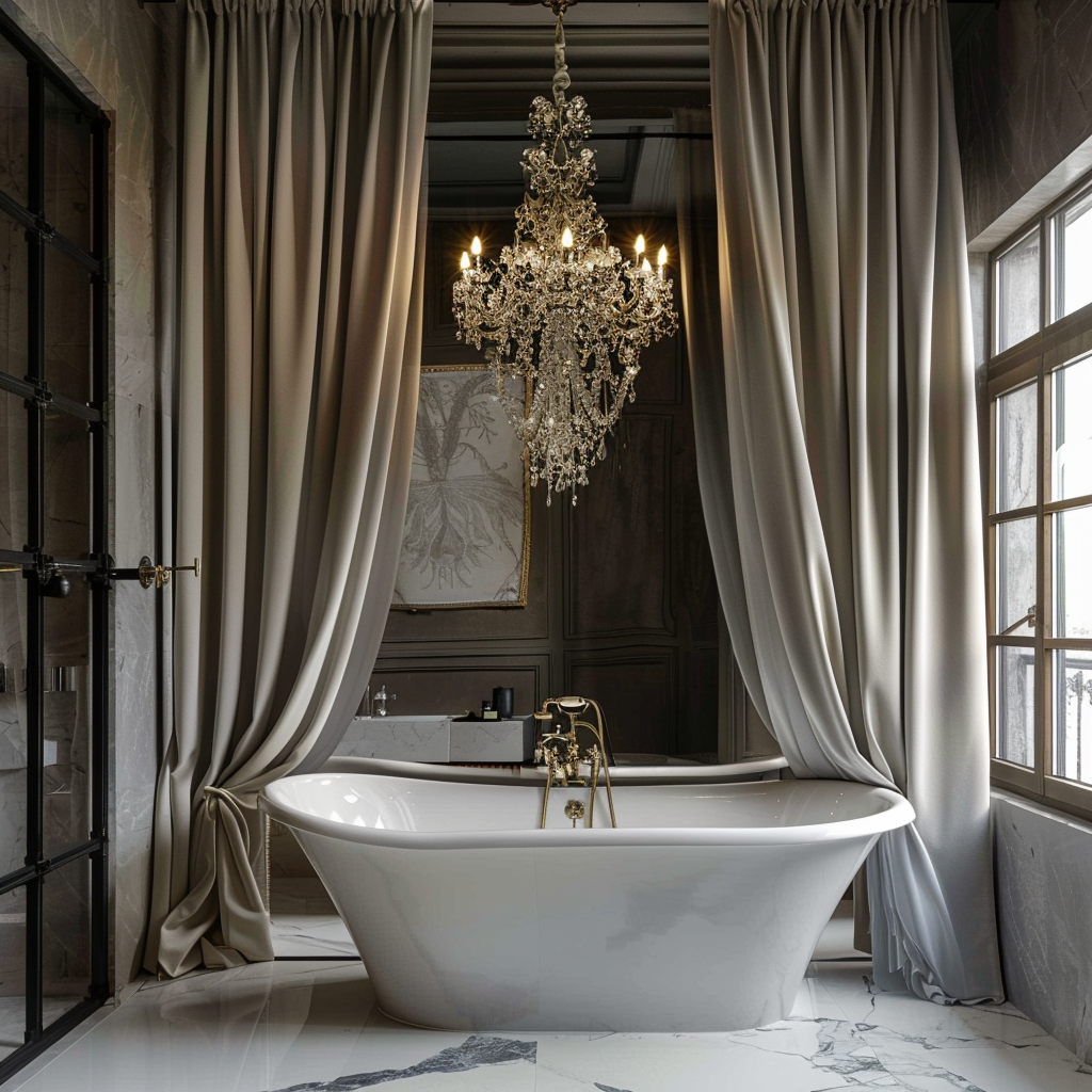 Классические шторы для ванной комнаты обычно имеют изысканный дизайн, который подчеркивает стиль помещения. Они могут быть выполнены из высококачественных тканей, таких как шелк, бархат или лён, что придает им роскошный вид.