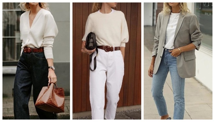Джинсы с высокой посадкой - это популярный тренд, который ценят модницы всех возрастов. В этой статье современные стилисты поделились идеями по созданию стильных образов с джинсами в этом сезоне. Заправленная блузка в звериный принт гармонично сочетается с актуальной моделью джинсов, а босоножки нюдового оттенка с тонкими ремешками добавляют завершающий штрих к современному образу. Джинсы + актуальная модель оверсайз рубашки — еще один гармоничный тандем, который можно носить, как со спортивной, так и элегантной моделью обуви. Перед вами пример шикарного монохромного аутфита, который получился с помощью белоснежных джинсов укороченного фасона с высокой талией, а также трикотажной светлой футболки. Чтобы разнообразить это светлое «полотно», стилисты добавили контрастный ремень, балетки с квадратным мысом карамельного цвета, а также черную плетеную сумку из натуральной кожи. Темный деним сейчас в моде. Чтобы аутфиты с темными джинсами выглядели гармонично и «свежо» их уместно дополнять с