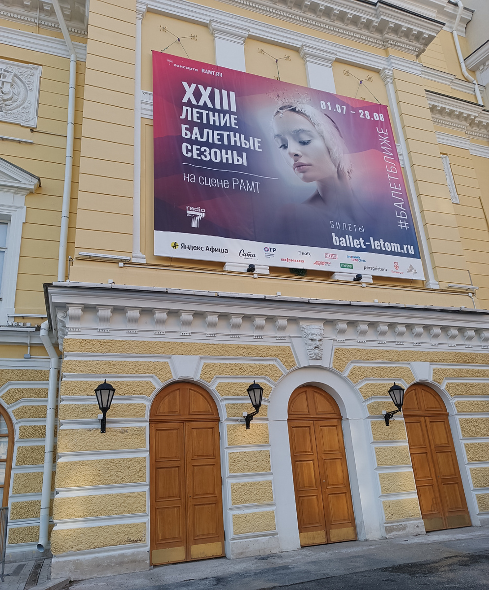 16 июля 2024 года Здравствуйте, друзья! В Москве установилась прекрасная летняя погода. Хотя большинство блогеров называют её аномальной жарой. Но ведь лето, мы так его ждали! А вы что хотели? +15, дожди, ветер? Многие москвичи предпочитают проводить выходные на берегах водоемов, или просто в многочисленных столичных парках, а мы вот решили иначе. И в воскресенье ближе к вечеру, после дождя, кстати, встретились с Леной (Искра) в самом центре, у метро Театральная, чтобы отправиться, конечно же, в театр. Нас ожидал вечер классического балета, Адольф Адан, "Жизель", хореография Мариуса Петипа, постановка Русского Классического Театра Балета. Баннер на фасаде театра РАМТ свидетельствует о том, что Летние балетные сезоны проводятся здесь ещё с самого начала 21-го века. Здание нынешнего театра РАМТ (Российский Академический Молодёжный Театр) старинное, с богатой театральной историей. Построено было ещё в 1821 году, потом не один раз перестраивалось. В середине 19-го века в здании собирался "