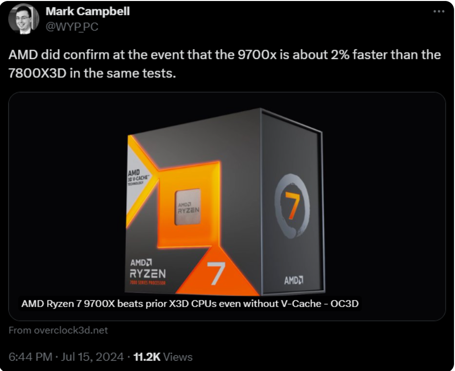 AMD Ryzen 7 9700X является 8-ядерным процессором на архитектуре Zen 5, который призван конкурировать с процессором Intel Core i5-14600K и, что наиболее важно, с процессором Ryzen 7 7800X3D от самой AMD, с момента своего запуска ставшим бестселлером в различных розничных магазинах. Чипы с технологией 3D V-cache считаются самыми эффективными и лучшими игровыми процессорами в своем ценовом диапазоне, но новые чипы Zen 5 должны быть в состоянии выгодно конкурировать со старыми моделями 3D V-cache. По словам Марка Кэмпбелла из Overclock3d, похоже, что настольный процессор AMD Ryzen 7 9700X сможет превзойти Ryzen 7 7800X3D в игровых тестах. Во время AMD Tech Day компания сравнила Ryzen 7 9700X только с гораздо более старым Ryzen 7 5800X3D, который показал феноменальные результаты на платформе AM4. По сравнению с Ryzen 7 5800X3D новый Ryzen 7 9700X демонстрирует прирост производительности в играх до 30 % и в среднем на 12 %. Это отличный результат, учитывая, что Ryzen 7 5800X3D имел TDP 105 В