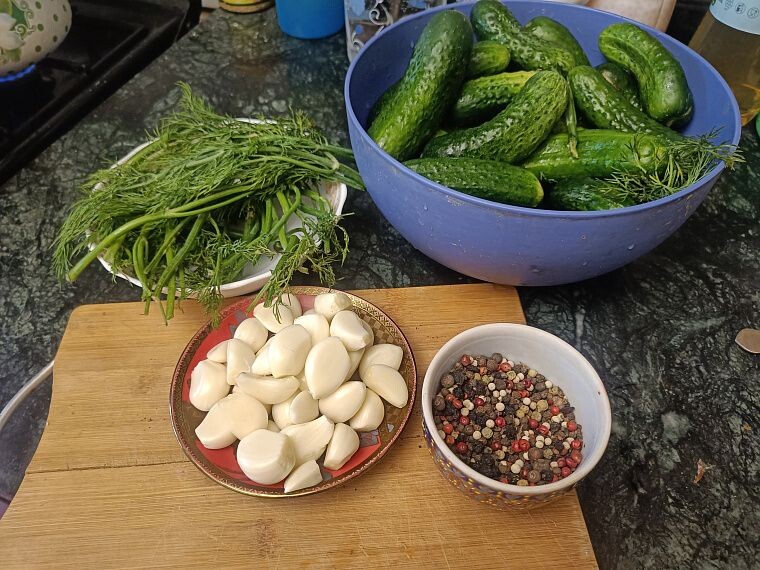 Огурцы и зелень хорошо моем, выкладываем в тазик и заливаем холодной водой, туда же кидаем чеснок. Оставляем замоченные огурцы минимум на три часа. Я всегда замачиваю на ночь, а утром начинаю закрутку. Если огурцы не вымачивать, они не будут хрустящими и