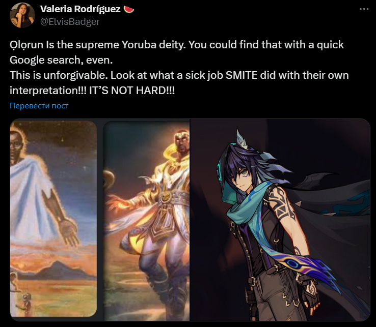 Свежий трейлер обновления 5.0 с новой игровой нацией для Genshin Impact вызвал значительное негодование в рядах нетакусиков в западном сообществе игры. В чем причина? Показанные в трейлере персонажи слишком белые! В данный момент разработчиков уже обвинили в отбеливании чернокожих героев, но почему-то никто не учитывает, что все герои в видео вымышленные и, скорее всего, ни в каких концептах у HoYoverse чернокожими никогда не были. https://youtu.be/q__fo0CSEcE А сейчас к маршу нетакусиков присоединились еще и актеры озвучки игры. Само собой, все эти оскорбленные актеры родились и живут в США или странах Европы. Вот, например, актриса озвучки Сетоса, одного из свежеанонсированных персонажей. Само собой, в профиле в наличии радужные флаги и наборы местоимений с множественным числом (They). С аналогичными заявлениями выступил актер озвучки Альбедо (не из "Повелителя", из Genshin Impact). Там же можно найти и заявление от актрисы, которая озвучила англоязычную Ёимию. Сложно сказать, сущест