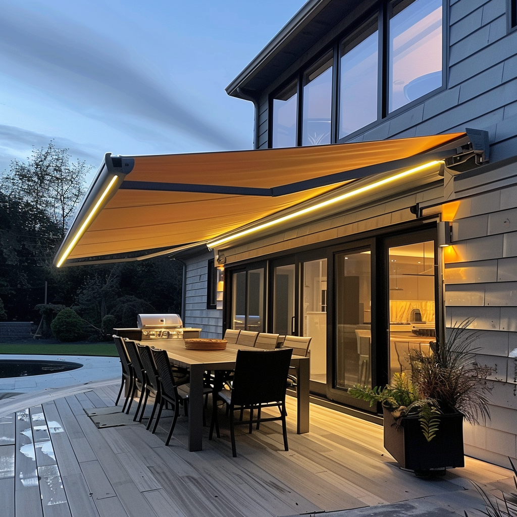 LED-подсветка стала очень популярным выбором для маркиз и тентов благодаря своей энергоэффективности, долговечности и яркости. LED-ленты можно легко установить вдоль карниза маркизы или внутри её конструкции, создавая эффектное освещение. Вы можете выбирать между различными оттенками белого света или даже цветными вариантами. 2. RGBI-подсветка: