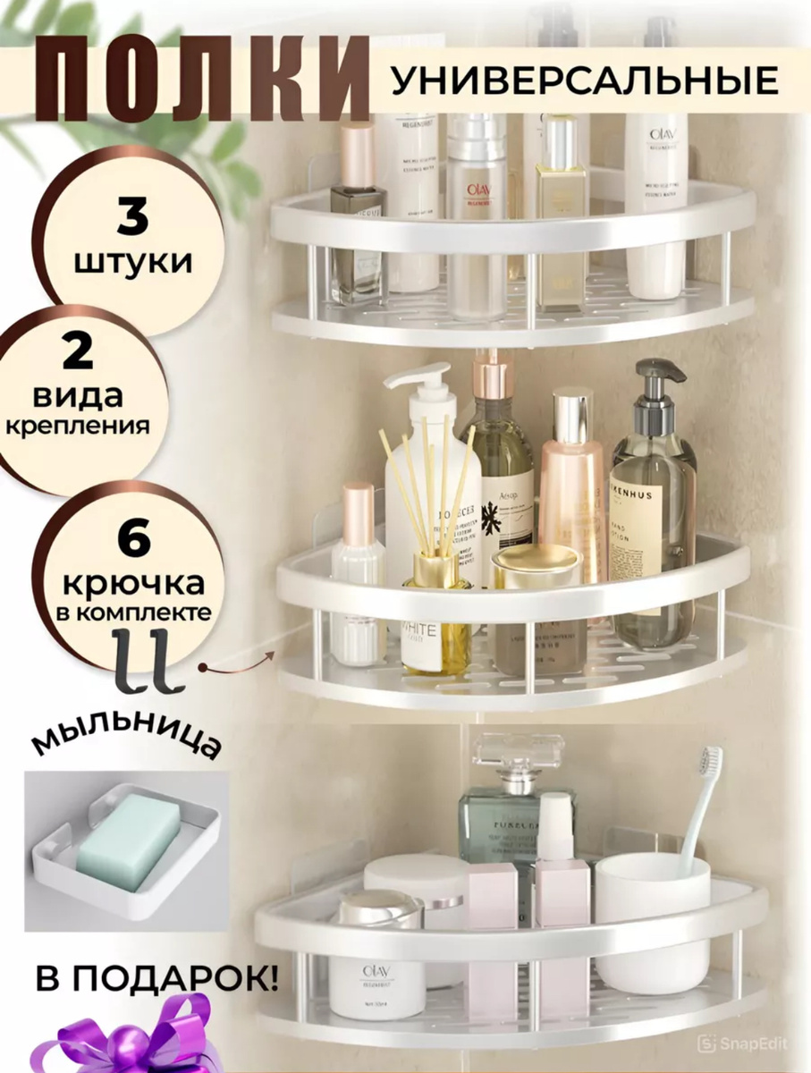 Удобные полки без сверления Стоимость: 1561 рублей Артикул: 219515336 Мыльный дозатор 420 мл. Стоимость: 835 рублей Артикул: 207664545 Металический держатель. Стоимость: 669 рублей Артикул: 177597038 Выдавливатель для тюбиков Стоимость: 234 рубля Артикул: 137536467 Набор Аксессуаров для ванны Стоимость: 1480 рублей Артикул: 169473943