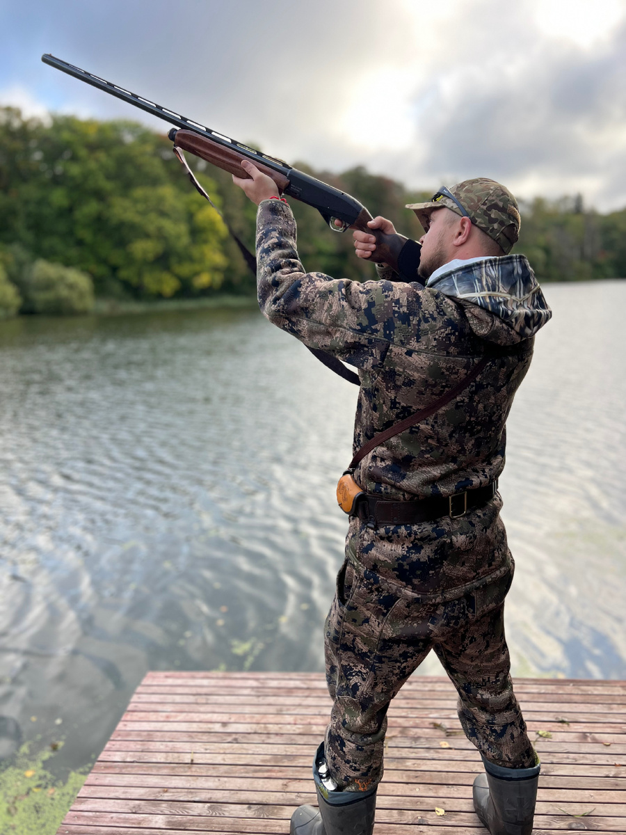 — Ну ты молодец! — сияет он. — Селезня подбил.