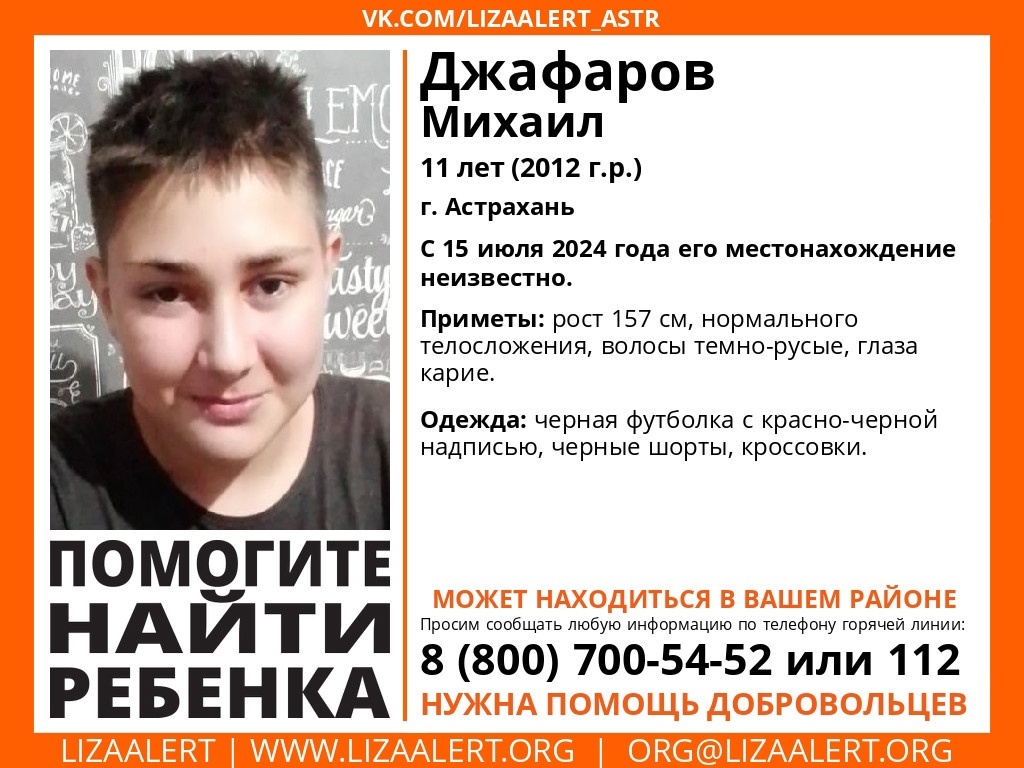 Поисковый отряд «ЛизаАлерт» обращается к жителям Астрахани с просьбой оказать помощь в поисках пропавшего мальчика, Михаила Джафарова. 11-летний ребёнок исчез 15 июля в Астрахани, его местонахождение не установлено. Приметы мальчика следующие: рост 157 см, нормальное телосложение, тёмно-русые волосы и карие глаза. На момент исчезновения он был одет в чёрную футболку с красно-чёрной надписью, чёрные шорты и кроссовки. Если вы видели Михаила или располагаете какой-либо информацией о его местонахождении, пожалуйста, немедленно свяжитесь с Катериной по номеру 89045231666 или с Анастасией по телефону 89107019743. Любая информация может оказаться ценной! Фото: ВК Лиза Алерт.Астрахань За последние сутки в стране утонули 32 человека. Такими данными поделилось издание «Юг России» со ссылкой на МЧС. За последние сутки в стране утонули 32 человека