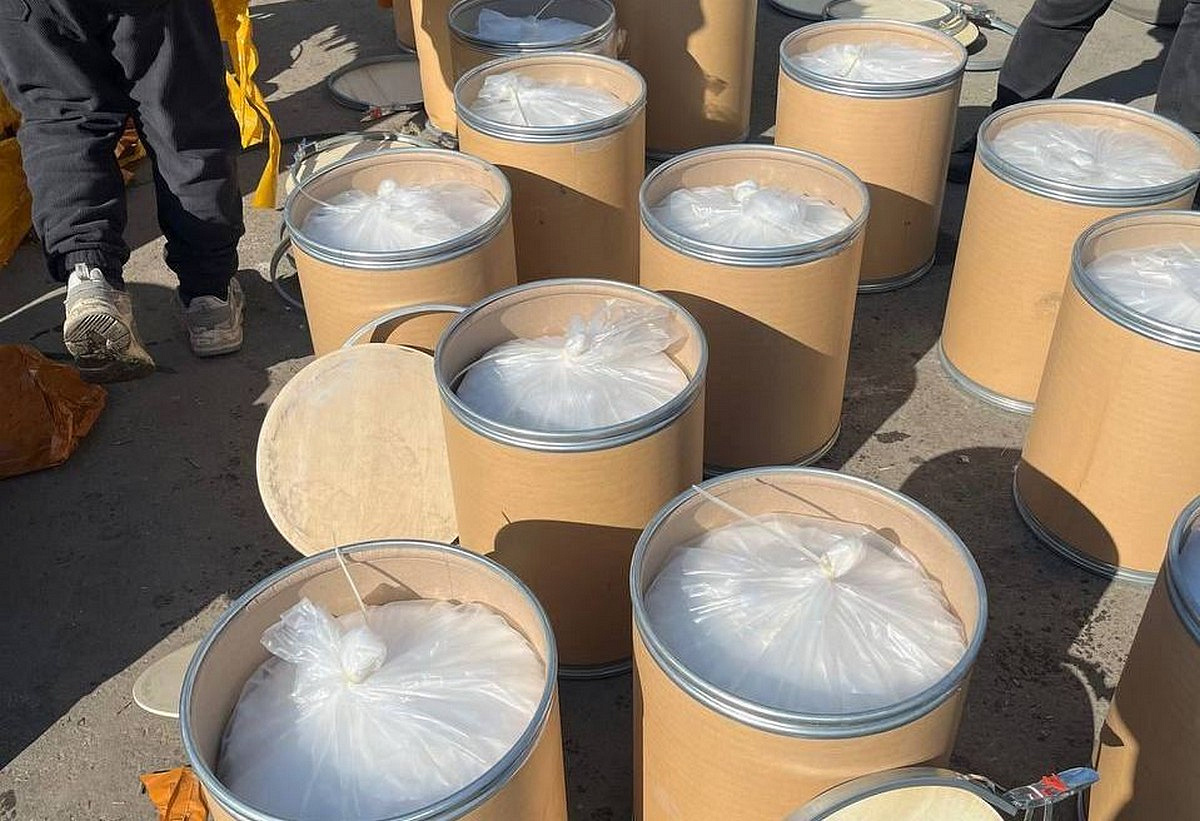 Наркотики были спрятаны среди одежды, техники и бытовой химии. Вещества упаковали в железные банки. В общей сложности в грузовике находилось 650 килограмм мефедрона и 150 килограмм сырья для его производства.