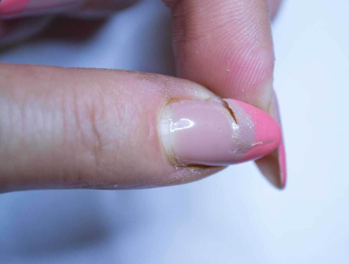 Это можно увидеть при выравнивании: когда блик от лампы расширяется ближе к торцу ногтя или выглядит как груша. Появляется нагрузка на свободный край и ногтевая пластина лопается. Возможна трещина сразу с двух сторон, из-за чего может возникать боль.
