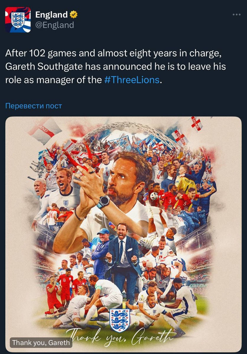 Ушла эпоха. Гарет Саутгейт – больше не тренер сборной Англии. Об этом сообщил официальный аккаунт команды. «После почти восьми лет работы и 102 игр у руля, Гарет Саутгейт объявил, что уходит с поста главного тренера сборной Англии» Поражение в финале Евро – последний матч для Гарета на посту тренера. «Время для новой главы». Открытое письмо Саутгейта Саутгейт сразу объяснил, что стоит за решением – в открытом письме на сайте футбольной ассоциации. «Для меня было честью играть за Англию и тренировать ее. Это многое значило для меня, и я отдавал всего себя этой работе. Но сейчас время для перемен, для новой главы. Воскресный финал против Испании в Берлине стал моей последней игрой в качестве главного тренера сборной. Я пришел в ФА в 2011 году – хотел улучшить английский футбол. За это время, включая восемь лет работы с главной сборной, меня поддерживали чудесные люди, которых я сейчас от всего сердца благодарю. Невозможно найти кого-то, кто бы помог мне больше, чем Стив Холланд. Он один