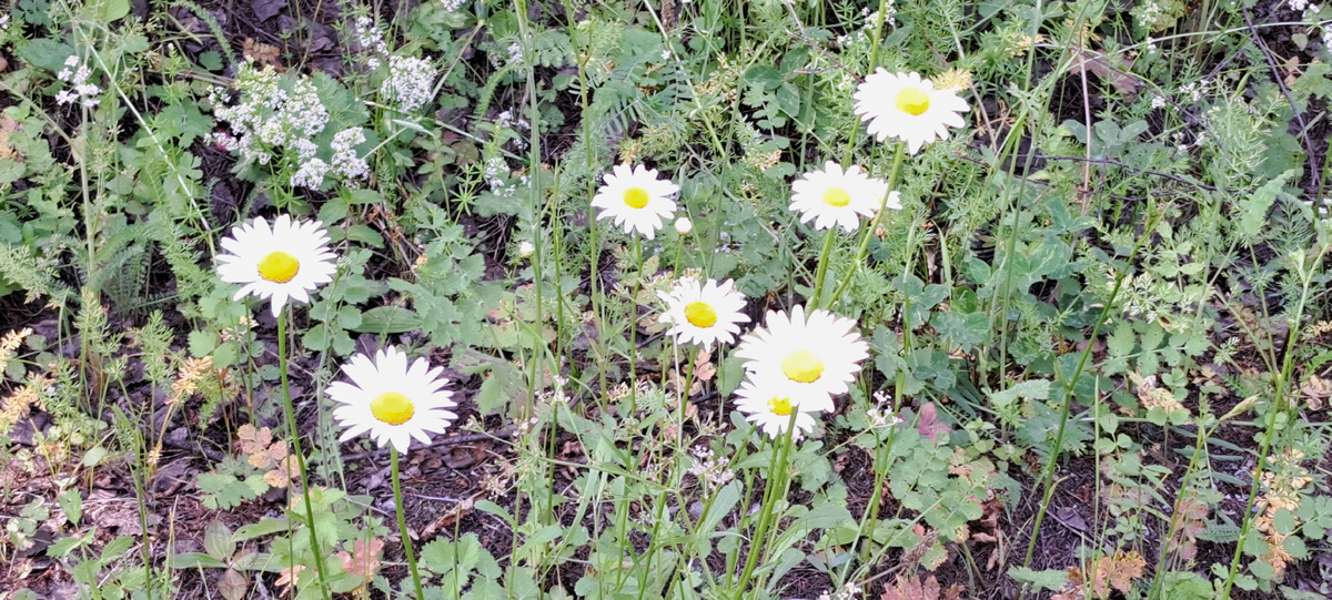 После обильных июньских и июльских дождей густо разрослись травы. Июль - время цветения большинства травянистых растений: раздолье для любителей заготовки фитосборов на зиму и для чая на текущий момент . Отложите чайные пакетики до зимы. На фото - ромашки, воспетые в песнях,а точнее - поповник. Аптечная ромашка другая. В июле продолжается сбор листьев березы, как мочегонного чая, средства против лямблий, язвы желудка. Продолжают цвести одуванчики, настой которых помогает при холецистите, снижает уровень сахара, очищает кровь и мочу, кишечник. предупреждает образование камней в почках, онкологию. В июле месяце созревают ягоды. Специалисты считают, что ягоды полезнее, чем фрукты. Снег в мае, последующая жара и дождливая неделя в июне привели к тому, что погибли цветы . Поэтому ягод земляники мало и они мелкие. Поэтому земляника на рынке дорогая. На кустарничках черники тоже только единичные ягоды. Тоже урожая не будет. После дождей стали встречаться грибы. Кроме сыроежек и дождевиков в