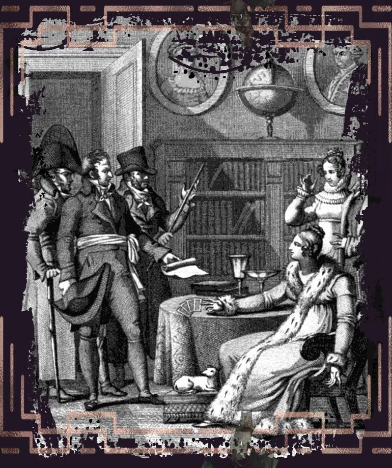 Знаменитая гадалка предупредила посетителя о том, что судьба будет улыбаться ему до сорока лет. После он покинет свою спутницу жизни и, не разобравшись в ходе исторических событий, совершит целый ряд непростительных ошибок. Мария Ленорман смогла полностью описать посетителю внешность его будущей первой супруги, встреча с которой состоится в ближайшее время. И молодой человек понял, что эту даму он видел в этой гостиной.