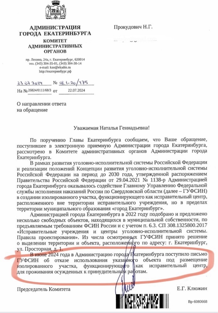 21 июля активистка Наталья Прокудович направила в мэрию Екатеринбурга запрос с просьбой прокомментировать ситуацию вокруг исправительного центра. 23 июля глава комитета административных органов Евгений Клюжин ответил ей, что в июне ГУФСИН свернуло проект. Об этом активистка сообщила 66.RU. Корреспондент 66.RU направил запрос в пресс-службы администрации и ГУФСИН по Свердловской области. Главная новость по теме