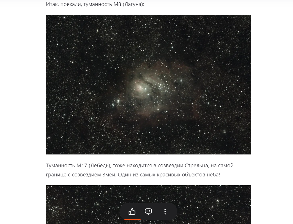 Друзья, буквально только что выложил фотографии, которые специально делал для экскурсии по звездному небу. Тут собраны одни из самых красивых объектов летнего неба: туманности Лагуна, Орёл, Лебедь, шаровое скоплении М22 и рассеянное скопление М11!