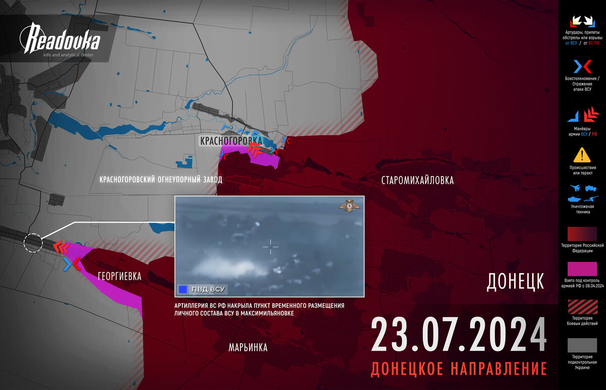 Однако самое главное происходит южнее, наши соединения, также не дожидаясь рассеивания части гарнизона Красногоровки по окружающим узлам обороны, приступили к штурму села Максимильяновка. Редакция Readovka предположила, что отводящийся из намечающегося окружения украинский гарнизон города может быть применен главным образом как подспорье для усиления противодействия ВС РФ именно в окрестностях Максимильяновки. Подкрепления в указанном районе нужны ВСУ для обустройства и «заселения» позиций в поселке Острое, у песчаного карьера, Селидовской ИТК № 82 и расположенного рядом с ней отвала породы, являющегося господствующей высотой.
