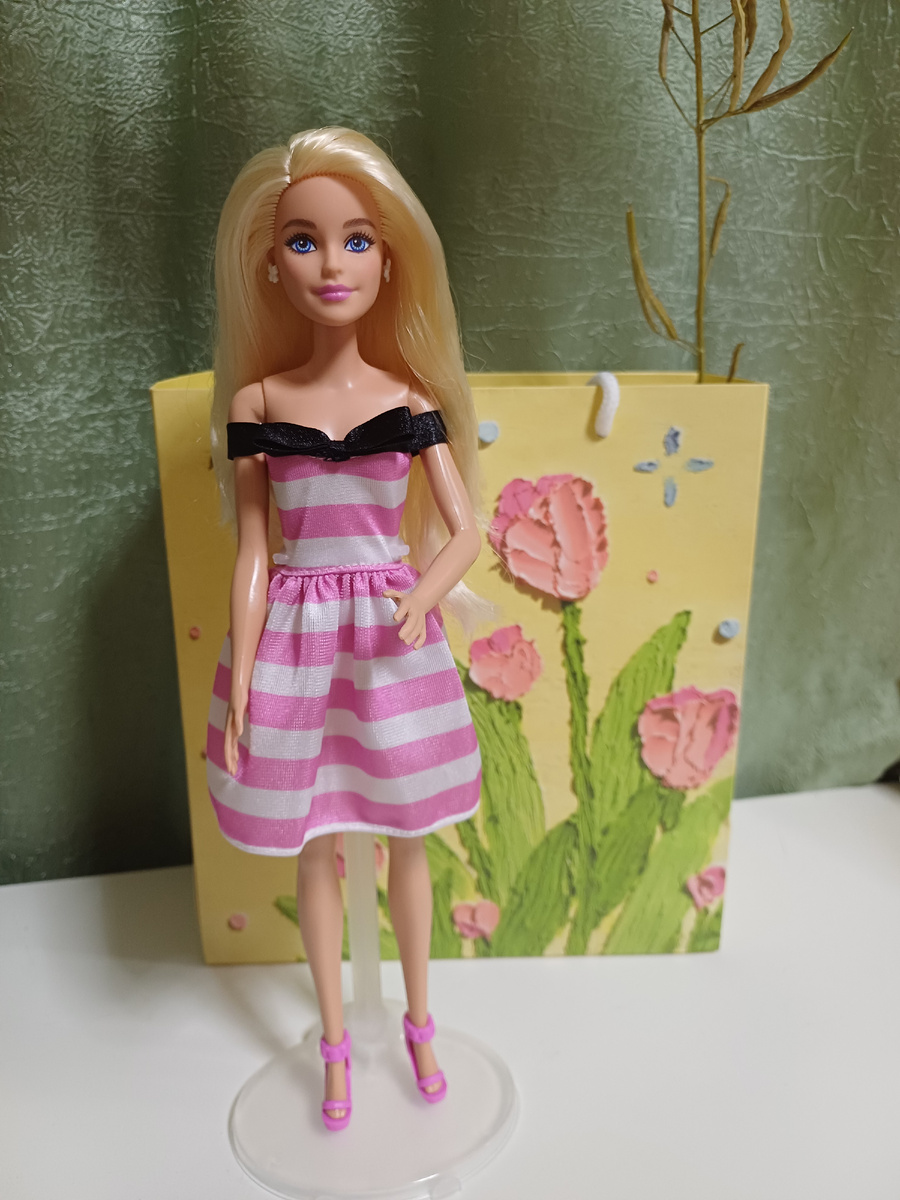 Очередная куколка в мою коллекцию - умница и красавица: И конечно - Барби! Не дорогая, но очень мне приглянувшаяся) Такая она была в коробчке: Mattel, 1000 руб. Плюсики: - идеальное милое личико - качественно сшитое платичко - красивые туфельки - хорошие, густые волосы Минусики: - негнущиеся ручки и ножки Да, куколка не шарнирная, но очень хороша. За достаточно бюджетную стоимость среди Барби - очень даже хорошенькая! Для игры - самое то. И расчесать и переодеть милое дело. Если очень хочется именно Барби - хороший вариант. Мне вот - очень захотелось и теперь эта милая девочка в моей мини- коллекции! И чувствую - она далеко не последняя))) 😉