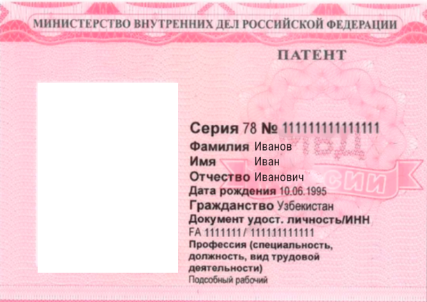 Патент представляет собой карточку с цветной фотографией, на которой указаны фамилия, имя, отчество иностранного гражданина, дата его рождения, гражданство, регион, в котором он может работать, дата выдачи патента и профессия. Наличие профессии в патенте определяется региональными законами, но если она указана, то работать можно только по ней.