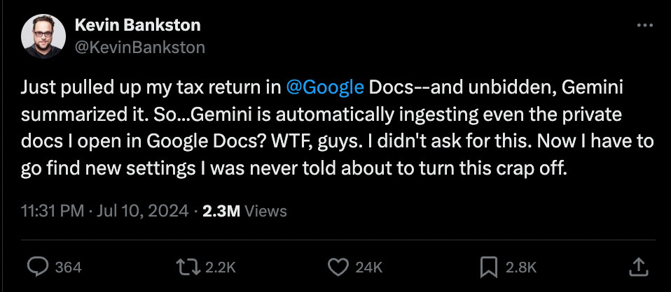 В рамках более широкого продвижения ИИ в технологической индустрии, хотим мы этого или нет, похоже, что сервис Google Gemini AI теперь читает частные документы на Drive без явного разрешения пользователя, согласно сообщению Кевина Бэнкстера в Xitter. Хотя Бэнкстер обсуждает причины, по которым это может быть сбоем для таких пользователей, как он, полное отсутствие контроля над его конфиденциальной, частной информацией неприемлемо для компании уровня Google — и не предвещает ничего хорошего для будущих проблем конфиденциальности в условиях часто принудительного внедрения ИИ. Похоже, ни служба поддержки Google, ни сам ИИ Gemini точно не знают, но у Кевина Бэнкстона есть теории, после предоставления более подробной информации в полной ветке. Вопреки первоначальному сообщению, технически это происходит в рамках Google Drive, а не конкретно Google Docs, хотя вполне вероятно, что проблема может относиться и к Docs. Но что вызвало эту проблему? По словам ИИ Google Gemini, настройки конфиденци