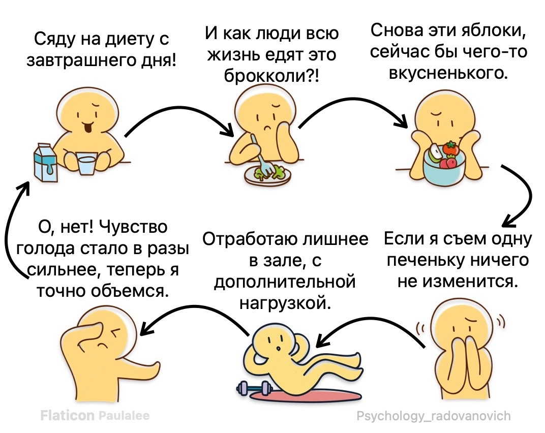 Почему диеты приводят к срыву и как перестать переедать? К чему ведут строгие правила и ограничения в питании. «Сегодня я снова не устояла перед шоколадкой, я слабый и безвольный человек». Подобные мысли усиливают негативное восприятие себя, вызывают стресс и желание "заесть" чувство собственной несостоятельности. Это в свою очередь снова закручивает череду перееданий и ограничений. Почему так страшно позволить себе желаемое. «Если я разрешу себе сегодня, то не смогу остановиться.» В работе с перееданием люди обычно испытывают страх касаемо того, что позволив себе питаться тем, что нравится, они будут ежедневно объедаться сладким или фаст фудом.