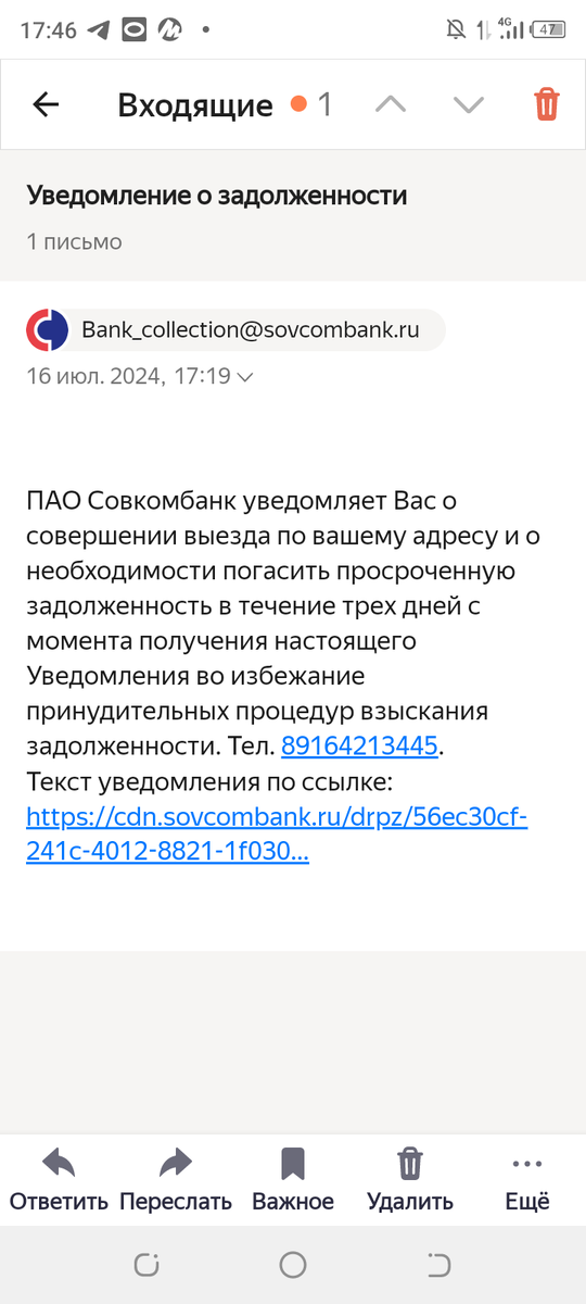 Я думаю многие получали вот такое вот в качестве смс или письма на электронную почту. Почему то банк всегда делает это часов так в 5 вечера наверное специально чтобы не приехать....Ещё мне угрожают судом (страшно сил нет) наверное банк забыл что мой долг давно просудил. До сих мне смешно от таких посланий.