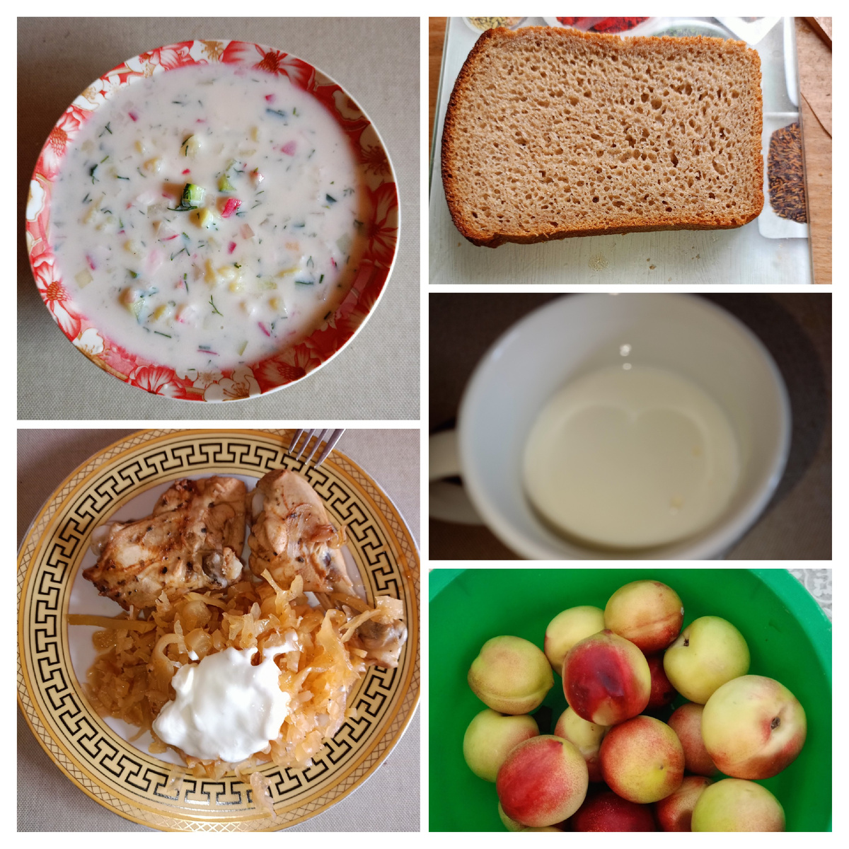 Потом доела окрошку, ее было больше 300 г, но я съела всю. Всегда любила окрошку и то, что она без колбасы или мяса только улучшило вкус. Мясо можно поесть и отдельно, тем более дочка приготовила куриную ножку на пару и тушёную капусту с морковкой и луком. К капусте я добавила ложку мацони.