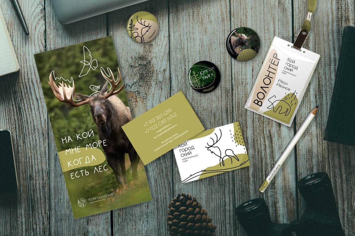 Лось! Это самый крупный зверь Койгородского национального парка и главный герой айдентики, которую мы разработали в 2020 году — к первой годовщине основания территории. Но, как говорится, не лосем единым. Другие животные — волк, заяц, медведь, лиса — тоже стали частью фирменного стиля. Стиль иллюстраций — линейный, причём линии непрерывные, объединяющие ландшафт и животных в цельную композицию. Такая концепция выбрана не случайно — она подчёркивает взаимосвязи в экосистеме, идею «единого организма» тайги. Основной цвет айдентики — зелёный, его оливковый оттенок. Это цвет жизни, гармонии, единения людей и природы. Другие цвета, белый и чёрный, используются для уравновешивания композиции, создания контраста. Дополнительная крафтовая текстура придаёт иллюстрациям объём и подчёркивает природные мотивы. Но разработка айдентики — это только полдела. Она должна жить, быть частью коммуникации. Спустя годы мы видим, что сотрудники на