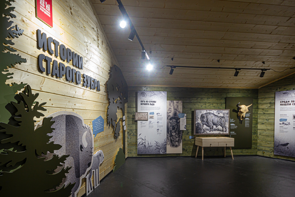 А рассказаны они в Доме зубра — нашем новом проекте, который мы создали для Мордовского заповедника. Историю жизни зубров мы показали как летопись, где каждой эпохе посвящён отдельный стенд. Миллионы лет назад вид эволюционировал и мигрировал, чтобы пережить Ледниковый период, а тысячи лет назад зубры нашли дом среди лесов. Но увы, в это же время человек уже вышел на охоту, и для зубров наступили по-настоящему тёмные времена — войны, революции, царская охота. Наконец, буквально вчера, в ХХ веке, человечество спохватилось — учёные и селекционеры сотворили чудо, возродили почти вымерший вид и вернули зубров в дикую природу. Сегодня одно из «воссозданных» стад живёт в Мордовском заповеднике — историческом ареале обитания зубров. Добро пожаловать на Родину! Рассказ дополняют интерактивы — они раскрывают темы биологии зубра. Чем он завтракает и что предпочитает на ужин? Наглядное меню — в выдвижных ящичках. Как выглядела его эволюционная адаптация? Можно узнать, открывая элементы пазла. Ка
