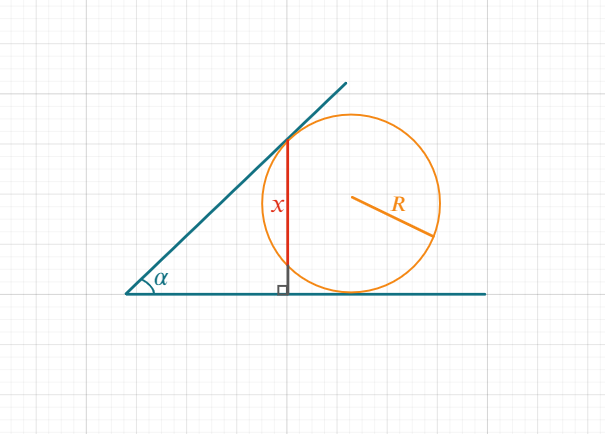 16. ★☆☆ Окружность радиуса R вписана в угол величины α. Из точки её касания с одной из сторон угла на другую его сторону опустили перпендикуляр. Найдите длину хорды окружности, лежащей на этом перпендикуляре