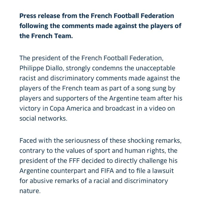 Федерация футбола Франции выпустила официальное обращение, в котором заявила, что подаст в суд на федерацию футбола Аргентины из-за оскорбительной песни, попавшей в соцсети после Копы-2024. Мотив - «расовые и дискриминационные лозунги». Также французы обратились с жалобой в FIFA. Напомним, в песне были строки о том, что французские футболисты родом из Анголы, а у Мбаппе была связь с трансвеститами. Мнение фанатов разделилось. 💭 «Какая часть песни была расистской? Они спели, что французские игроки на самом деле не из Франции. И это правда». 💭 «То есть Мбаппе не камерунец?» 💭 «Да. Это правильно. Нужно наказать этих аргентинских расистов». 💭 «Отлично, аргентинцам не сойдет это с рук».