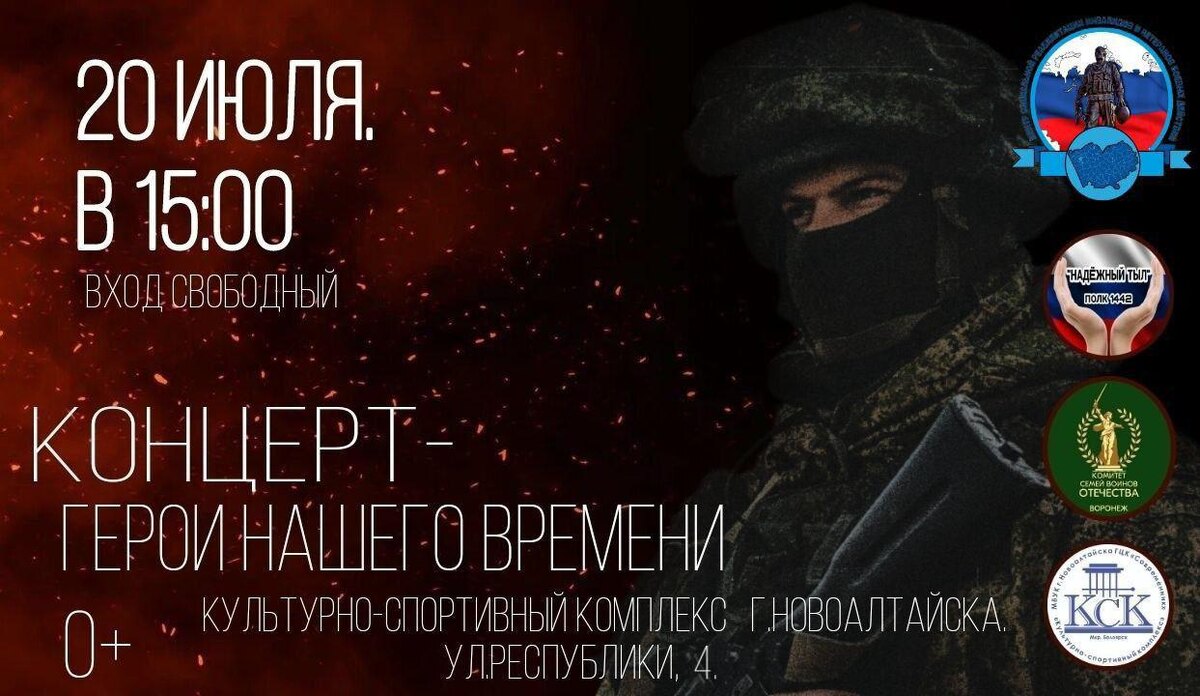 В субботу, 20 июля в 15:00, в городе Новоалтайске по адресу: ул. Республики, 4, в культурно-спортивном комплексе Белоярск пройдет патриотический концерт «Герои нашего времени». Мероприятие организовано в поддержку всех, кто сражается на фронте и кует победу в тылу, а главными его темами станут – любовь, патриотизм и Родина! В преддверии концерта в 14:00 состоится ярмарка изделий ручной работы, которую организует гуманитарное движение «Надежный тыл». Также Центральная библиотека им. Мерзликина представит книги, газеты, документы и записки времен Великой Отечественной войны и о ней, а Михаил Глазырин, председатель комитета ветеранов Ленинского района г. Барнаул, проведет выставку военных экспонатов, коллекцию которых лично собирал долгие годы. На самом концерте выступят артисты и творческие коллективы Алтайского края. Среди них, педагог народного вокала «Матаня» Жукова Татьяна Павловна, выпускница детской школы искусств №3 София Чумакова. А также ансамбль «Хорошее настроение», солистка