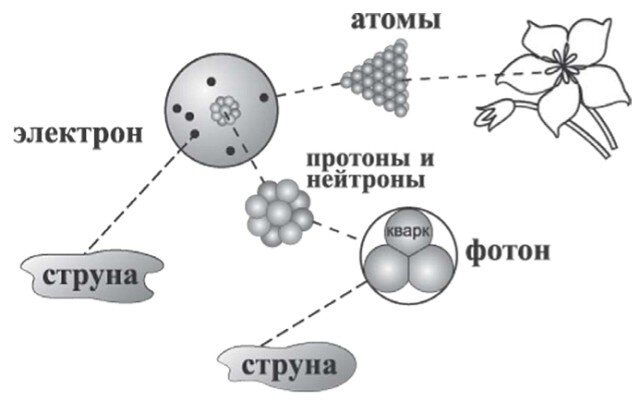 Теория струн предлагает идею, что фундаментальные частицы, такие как электроны и кварки, не являются точечными объектами, а скорее крошечными одномерными струнами. Эти струны могут вибрировать различными способами, и именно эти вибрации определяют свойства частиц, такие как масса и заряд. В отличие от традиционных теорий, где частицы представляются как нулевые размеры точки, струны имеют длину, хотя она невероятно мала — порядка длины Планка (около \(10^{-35}\) метров).