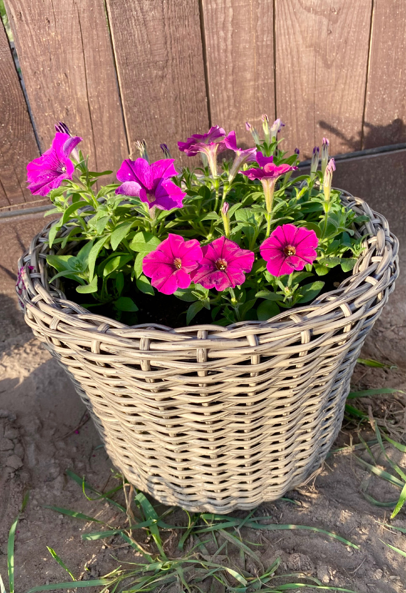 Цветочки цветут. Петунии очень комфортно в кашпо, которое я сплела своими руками. Зимой в планах сплести ещё несколько штук.