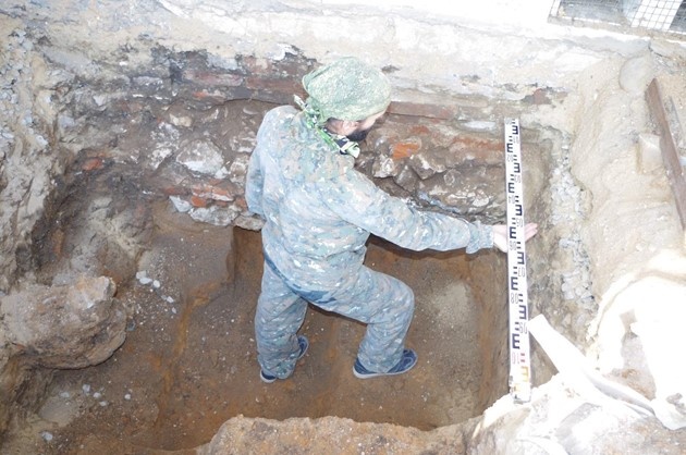 Фотофиксация вертикальных плоскостей шурфа и фундамента с геодезической рейкой.