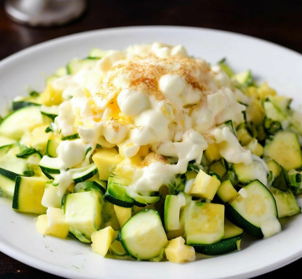 Ингредиенты: - 1 кабачок - 2 плавленых сырка - 4 яйца - 3 зубчика чеснока - Майонез - Зелень Приготовление: 1. Кабачок нарезать кубиками и обжарить на сковороде до золотистой корочки. 2. Яйца сварить вкрутую и нарезать кубиками. 3. Плавленые сырки натереть на терке. 4. Чеснок измельчить. 5. Смешать все ингредиенты, заправить майонезом и посыпать зеленью. Приятного аппетита!