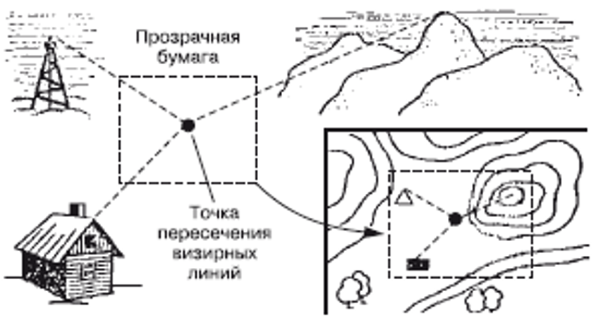 После этого накладываете листу бумаги (он странным образом должен оказаться прозрачным) на карту, цепляете эти три линии за точки привязки на ней и понимаете, что находитесь между крематорием, кладбищем и курганом.