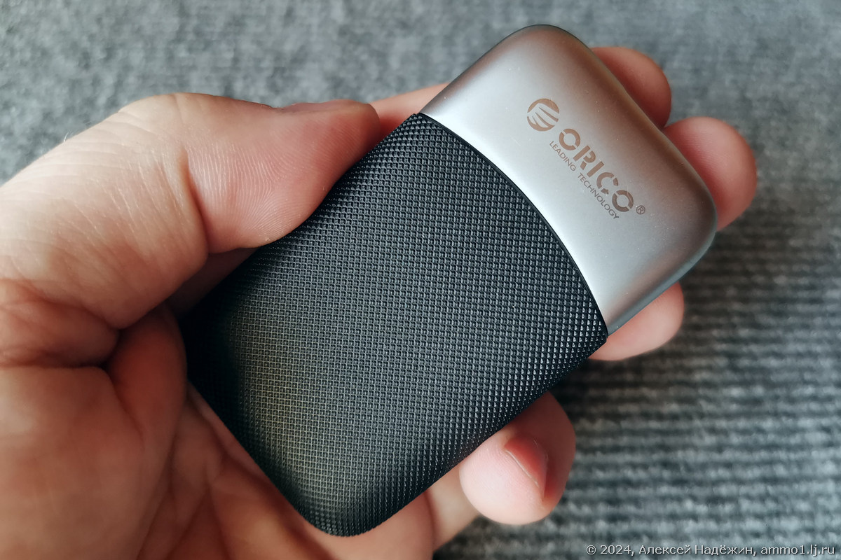 Компактный внешний SSD-диск позволяет не только переносить большие объёмы информации, но, благодаря высокой скорости, его можно использовать, как рабочий диск, переносимый между разными компьютерами. Я протестировал внешний SSD диск ORICO Taichi, имеющий объём 1 ТБ. Накопитель маленький (80x45x11 мм) и легкий (38 грамм). Рядом с 2.5-дюймовым внешним жёстким диском он смотрится совсем малюсеньким. В комплекте универсальный кабель USB C - USB C с переходником на USB A и инструкция. Существует две версии этого накопителя - с интерфейсом USB 3.2 Gen2 (скорость обмена до 10 Gbps) и USB 3.2 Gen2x2 (скорость обмена до 20 Gbps). Объём может быть 512 ГБ, 1 ТБ и 2 ТБ. Мой вариант 1 ТБ 10 Gpbs отмечен галочками на задней стороне коробки. Верхняя часть накопителя металлическая, нижняя пластиковая. Рядом с разъёмом расположен маленький синий светодиод состояния. Когда кабель используется в режиме USB A, разъём с переходником получается довольно длинным. Накопитель отформатирован на заводе в exFAT,