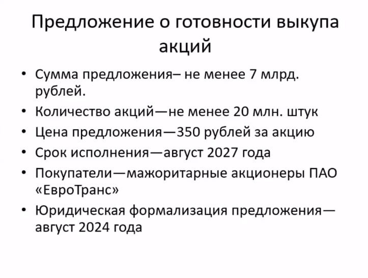 -Самое приятное — цена выкупа. Она чуть-ли не 3 раза выше, чем цена, по которой сейчас торгуются акции (цена выкупа 350р, а торгуются сейчас акции примерно по 117р). В общем. новости безусловно позитивные.