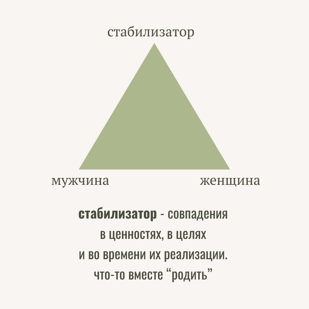 Мы можем представить отношения в паре треугольником, на вершинах которого будут женщина, мужчина, стабилизатор. Иногда стабилизатором выступает третий человек – любовник или любовница. Нередко так происходит, когда у пары расходятся ценности, а цели не совпадают во времени.