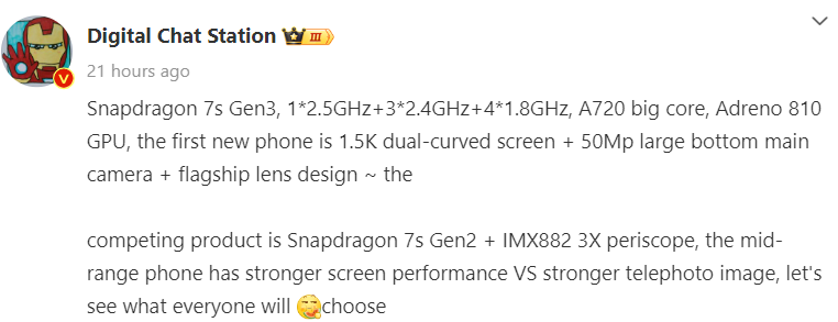 Компания Redmi работает над серией смартфонов Redmi Note 14. Согласно недавней утечке, серия Redmi Note 14 может поставляться с совершенно новым процессором Snapdragon 7s Gen 3, пишет Gizmochina. источник изображения: GizmochinaПо словам источника Digital Chat Station, предстоящий процессор Snapdragon 7s Gen 3 будет поддерживать устройство с двусторонним изогнутым экраном, который предлагает разрешение 1,5K и 50-мегапиксельную тройную камеру, оснащенную флагманским дизайном объектива. Похоже, что эти детали относятся к одному из предстоящих смартфонов серии Redmi Note 14 Pro. источник изображения: Gizmochina Digital Chat Station заявила, что смартфон будет конкурировать с другим устройством, которое имеет чип Snapdragon 7s Gen 2 в паре с 3-кратной перископической камерой Sony IMX882 (LYT-600). Этим устройством может быть Realme 13 Pro+. На изображении выше видно, что предполагаемый Snapdragon 7s Gen 3 набрал 1175 баллов в одноядерном и 3157 баллов в многоядерном тесте на платформе Geek