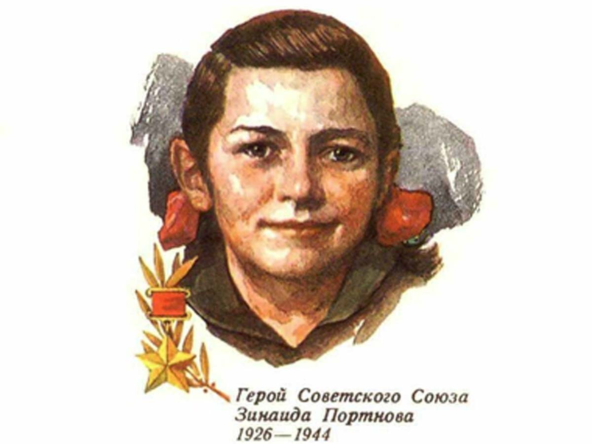 ЗИНА ПОРТНОВА Зинаида Мартыновна Портнова (партизанский псевдоним — Зина или Зойку) — советская подпольщица, партизанка, член подпольной организации «Юные мстители», разведчица партизанского отряда имени К. Е. Ворошилова на временно оккупированной территории Белорусской ССР. Родилась 20 февраля 1926 года в Ленинграде. В начале июня 1941 года приехала на школьные каникулы в деревню Зуи Витебской области. С началом войны оказалась на оккупированной немцами территории. В 1942 году стала членом Обольской подпольной комсомольской организации «Юные мстители». Участвовала в распространении листовок среди населения и диверсиях против захватчиков. Работая в столовой курсов переподготовки немецких офицеров, по указанию подполья отравила пищу (погибло более ста офицеров). Во время разбирательств, желая доказать немцам свою непричастность, попробовала отравленный суп. Чудом осталась жива. С августа 1943 года Зина — разведчица партизанского отряда им. К.Е. Ворошилова. В декабре 1943-го, возвращаясь