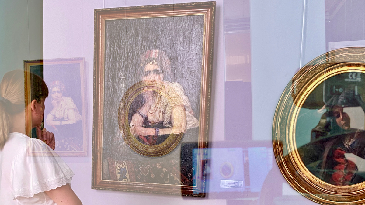 В экспозиции новой выставки представлены портреты из коллекций Дагестанского музея изобразительных искусств имени П.С. Гамзатовой и Тульского музея изобразительных искусств. Русский портрет прошел яркий и самобытный путь. От парсуны до тонкого психологического образа, через который художники мастерски научились раскрывать внутренний мир и чувства портретируемого. Дагестанский музей изобразительных искусств предоставил пять портретов. О них я расскажу поподробней. Блестящий живописец и великолепный портретист Карл Брюллов считается одним из главных представителей портретного жанра начала XIX столетия. Картина «Итальянка у бассейна» была создана им в 1844 году после возвращения из Италии. Молодая красавица в ярком народном костюме пронизана солнечным светом. Благодаря деталям художник сумел показать и горячий итальянский нрав, изобразив на заднем плане дикий виноград, и закрытость девушки, ограничив ее глухой стеной. Напротив не менее характерная «Одалиска» Василия Поленова. Во время пу
