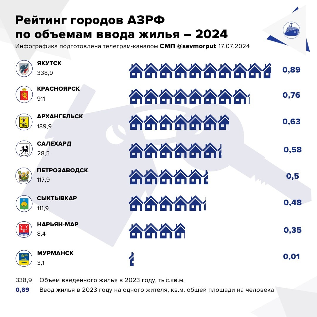 Более 110 миллионов квадратных метров жилья введено по итогам 2023 года в России. Города АЗРФ показали разнонаправленную динамику в «строительном» рейтинге — если Якутск вошел в топ-30, то Мурманск оказался в национальных аутсайдерах. Больше всего жилья в расчете на одного человека среди городов АЗРФ строится в Якутске (Республика Саха) — здесь показатель составил 0,89. При этом всего в прошлом году в городе было построено 338,9 тыс кв.м. жилья. В общефедеральном списке Якутск на 22-м месте. В пятерке лидеров по Арктике также Красноярск (0,76, 33-е место, Красноярский край), Архангельск (0,63, 48-е место, Архангельская область), Салехард (0,58, 58-е место, Ямало-Ненецкий автономный округ), Петрозаводск (0,5, 70-е место, Республика Карелия). Сыктывкар (Республика Коми) с показателем 0,48 и общим количеством построенного жилья 111,9 тыс кв.м. занял 72-е место национального рейтинга. Нарьян-Мар (Ненецкий автономный округ) — на 85-й строчке с показателем 0,35 и общим объемом новостроек
