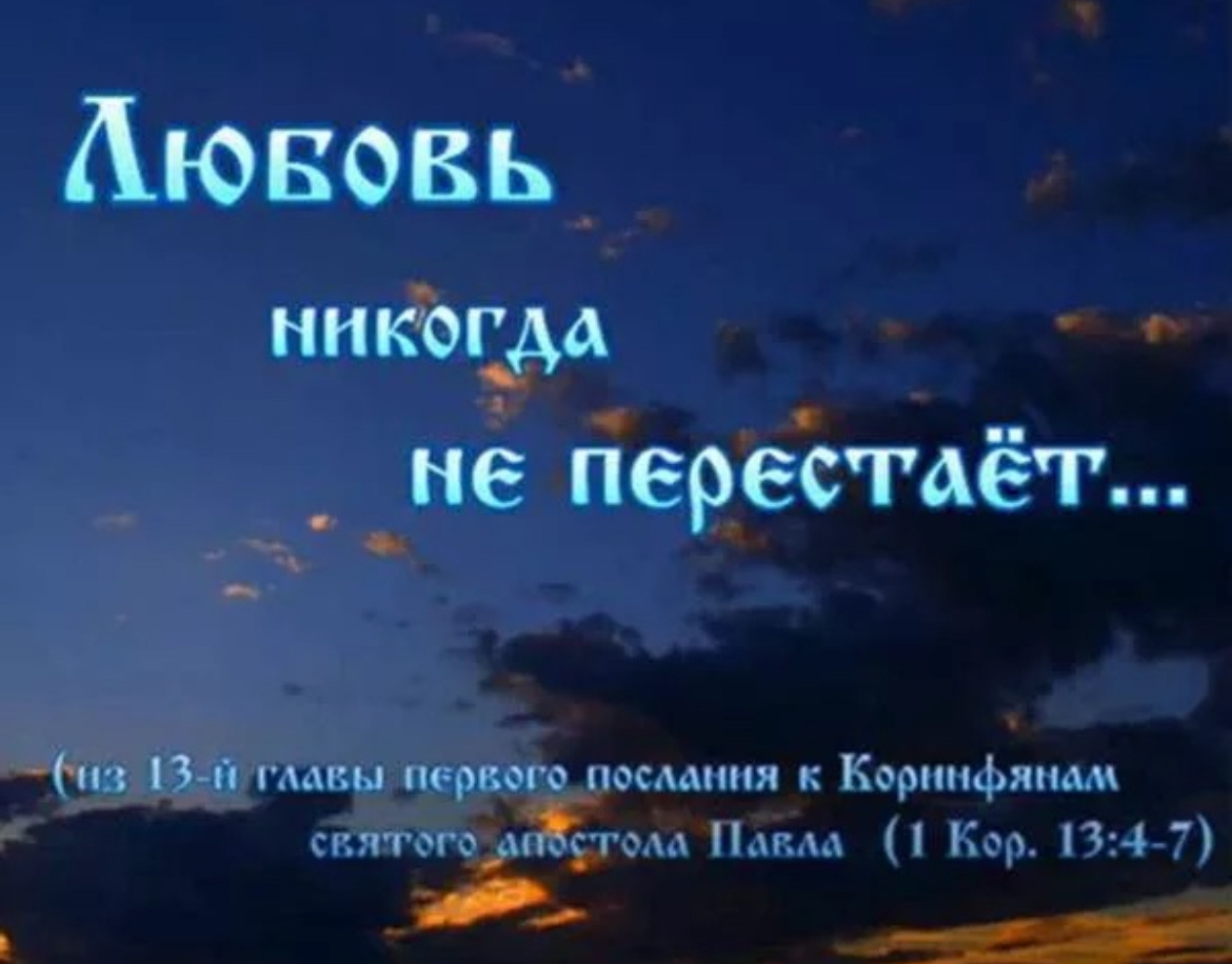 «Любовь долготерпит, милосердствует, любовь не завидует, любовь не превозносится, не гордится, не бесчинствует, не ищет своего, не раздражается, не мыслит зла, не радуется неправде, а сорадуется истине; все покрывает, всему верит, всего надеется, все переносит. Любовь никогда не перестает, хотя и пророчества прекратятся, и языки умолкнут, и знание упразднится».
