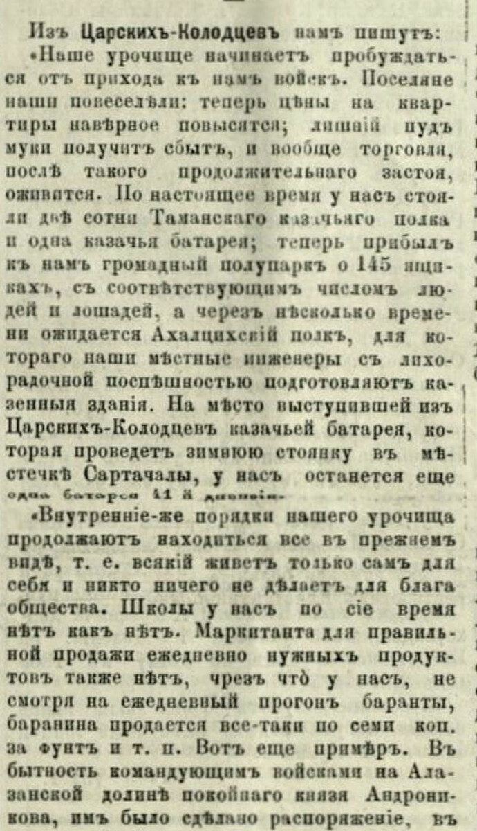 Из Царских Колодцев нам пишут: Наше урочище начинает пробуждаться от прихода к нам войск. Поселяне наши повеселели: теперь цены на квартиры наверное повысятся; лишний пуд муки получит сбыт, и вообще торговли, после такого продолжительного застоя, оживится. По настоящее время у нас стояли две сотни Таманского казачьего полка и одна казачья батарея; теперь прибыл к нам громадный полупарк о 145 ящиках, с соответствующим числом людей и лошадей, а через несколько времени ожидается Ахалцихский полк, для которого ниши местные инженеры с лихорадочной поспешностью подготовляют казённые здания. На место выступившей из Царских Колодцев казачьей батарея, которая проведет зимнюю стоянку в местечке Сартачалы, у нас останется еще одна батарея 41-й дивизии. «Внутренние же порядки вашего урочища продолжают находиться все в прежнем виде, то есть всякий живёт сам для себя, и никто ничего не делает для блага общества. Школы у нас по сие время нет как нет. Маркитанта для правильной продажи ежедневно нужных