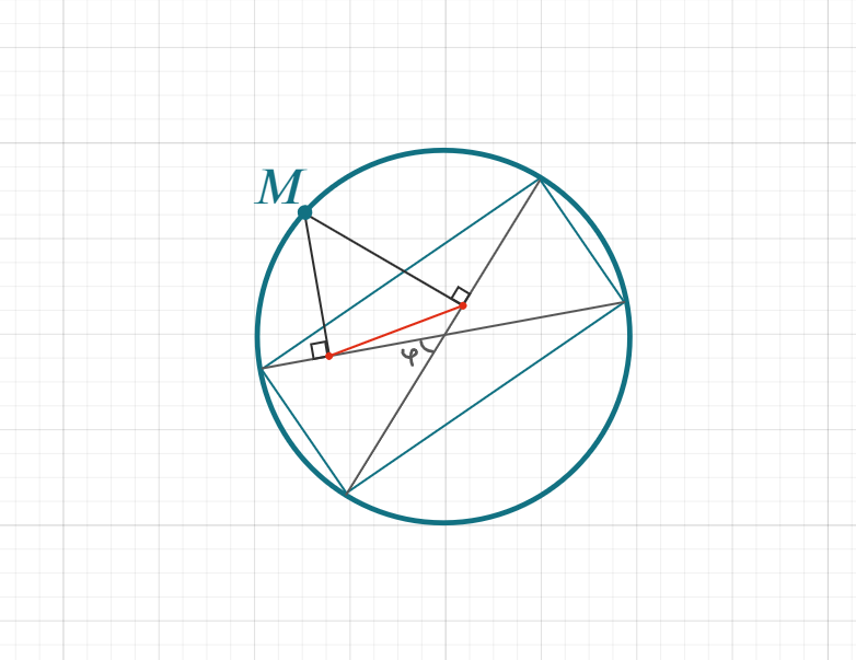 19. ★★☆ Из произвольной точки М окружности, описанной около прямоугольника, на две его диагонали опустили перпендикуляры. Найдите длину x отрезка, соединяющего основания этих перпендикуляров, если диагонали прямоугольника равны d, а угол между ними равен φ