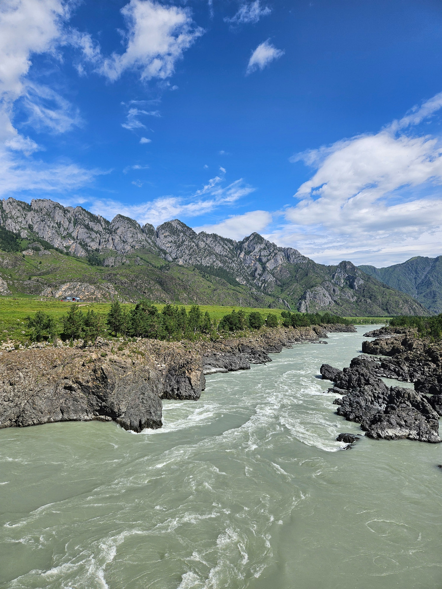 Горный Алтай День первый. Ороктойский мост Ороктойский мост построен в самом узком и глубоком месте красавицы Катуни. По некоторым данным глубина реки под мостом достигает 70-ти метров, а ширина всего 20-ти из-за того, что находится на месте тектанического разлома, появившегося несколько тысяч лет назад после извержения вулкана. Пороги в этом месте именуются Тельдекпеньскими и выглядят очень эффектно благодаря своему тёмному цвету. У местных жителей есть легенда об этом месте. И конечно же участвует в ней алтайский силач Сартыкпай: "Камни являются строительным материалом, которые принес алтайский богатырь Сартыкпай в подоле лисьей шубы. Силач хотел помочь людям и возвести переправу через Катунь, но попытка оказалась неудачной. В сердцах горе-строитель раскидал камни во все стороны, в результате чего и появились Тельдекпенские пороги". Ороктойский мост был построен взамен снесённому очередным половодьем в 1997 году. От женщины, что торгует разными сувенирами, узнала, что раньше, ещё